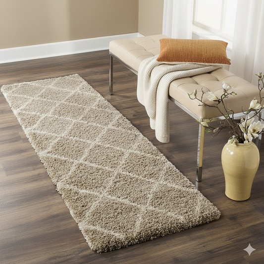 Moroccan Style Microfiber Runner – Beige & Ivory Mix with Rubber Backing & Anti-Skid, Soft Feel