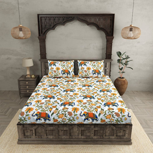 Kashyapa Rugs - Premium Blue Elephant 🐘 Jaypuri Design Glace Cotton Fitted Bedsheet – Double Bed Size with 2 Pillow Covers