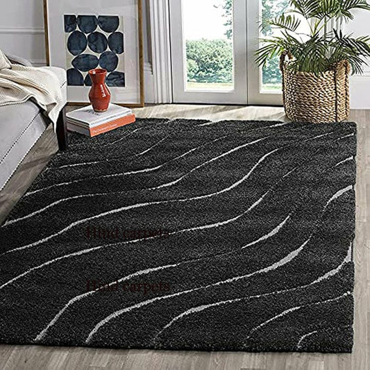 Black Waves Premium Microfiber Shaggy Carpet Rug – Soft Feel with Anti-Skid Rubber Backing