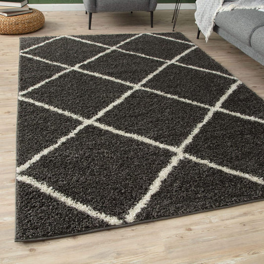 Black with Ivory Diamond Pattern Shaggy Rug – Hand-Tufted Microfiber Carpet – Soft Feel & Anti-Skid Rubber Backing