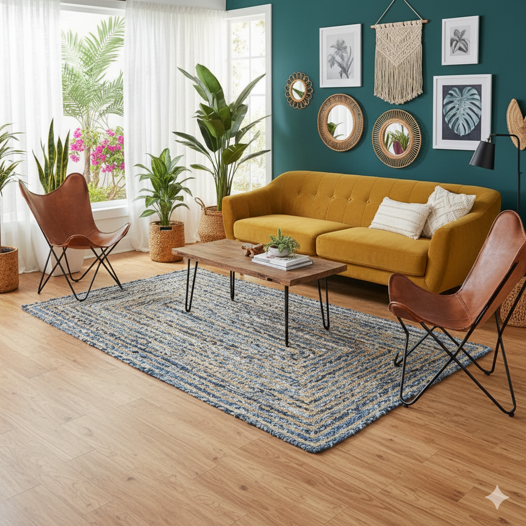 The jute and denim rug has subtle hues which have tied up all the colours of my home and made it a lovely bohemian space